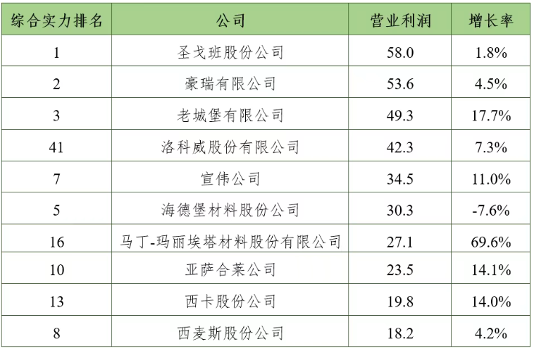 圣戈班股份公司(法國)連續三年位居綜合實力第一名,營運利潤率和現金流創造新紀錄,并通過收購業務,不斷擴大在化學建材領域的份額;豪瑞有限公司(瑞士)穩居第二名,流動資產略有下降,其余指標均有不同程度的增長;老城堡有限公司(愛爾蘭)營業利潤繼續保持增長態勢,排在第三名;中國建材股份有限公司營業收入和營業利潤降低,排在第四名; 海德堡材料股份公司(德國)營業利潤小幅下降,其余指標略有增長,排在第五名。亞薩合萊公司(瑞典)營業收入和利潤率均達到了兩位數的增長,首次躋身前十。