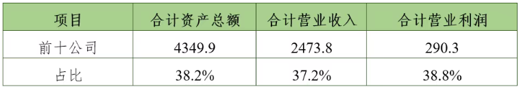 與2024年前十名公司相比,本次前十名公司的合計資產總額減少1.8%,合計營業收入減少5.3%,合計營業利潤增加3.0%。前十名公司的合計資產總額、合計營業收入在百家公司總額中的占比分別減少1.5個百分點和0.9個百分點,合計營業利潤占比則增加2.1個百分點。頭部企業保持了較強的盈利能力。