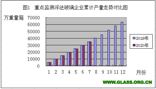 2019年與2020年重點監測浮法玻璃企業累計產量走勢對比圖(2020年7月份)