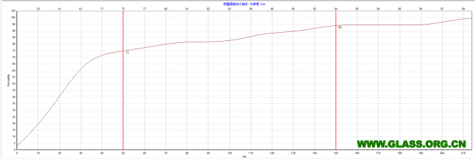 量統(tǒng)計曲線,在指定的質(zhì)量閾值點查看變形量的累積占比,即可反映該片玻璃的整體質(zhì)量水平,PV值表征玻璃的平整度、OP值表征玻璃的光焦度(影像變形)水平,如上圖,它表明該片玻璃光焦度低于50mdpt的部分累計占比達75%,而超過150mdpt的部分占比為6%。