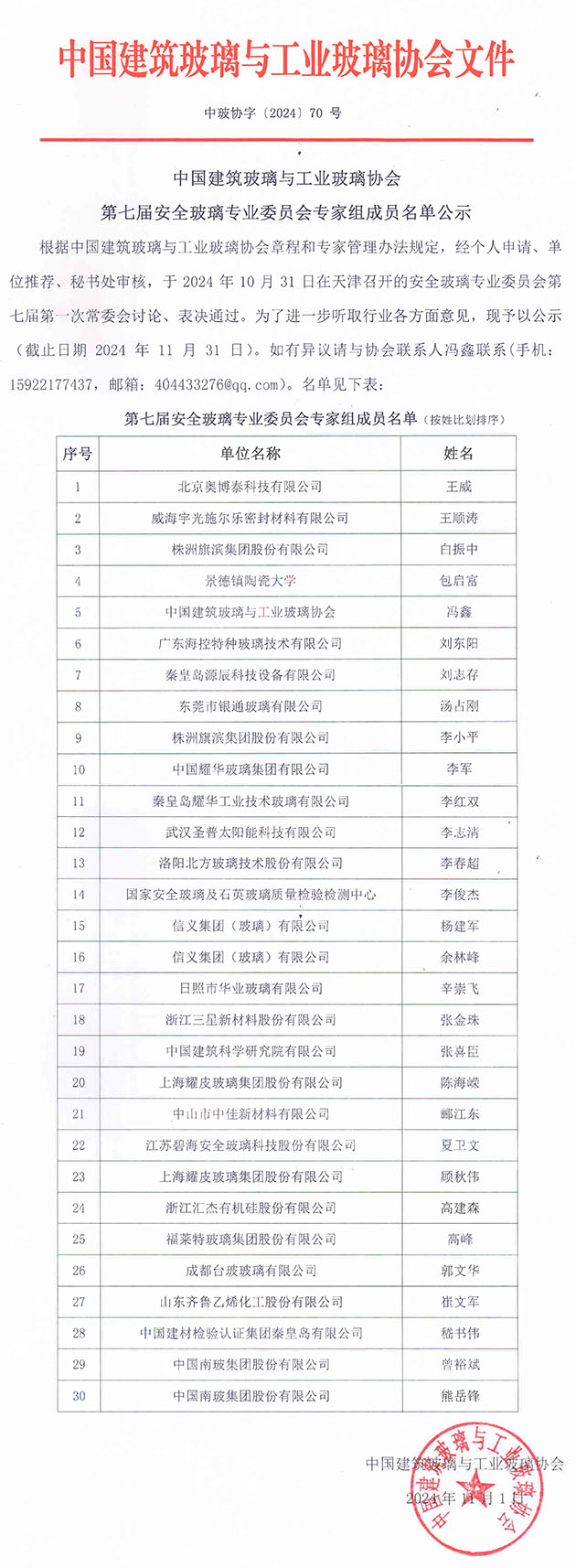 平板玻璃專業委員會專家名單公示
